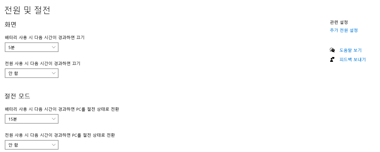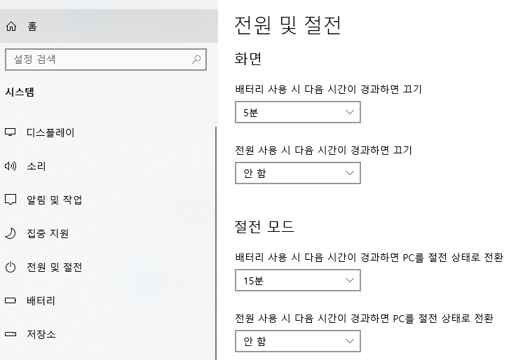 5. 전원 사용 시 다음 시간이 경과하면 끄기 -> 안함
