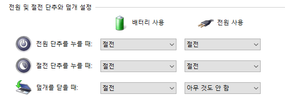 9. 덮개를 닫을 때 -> 전원사용을 '아무 것도 안함'으로 누르기