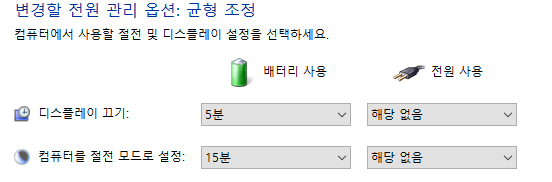 15. 전원 사용 둘다 '해당 없음' 누르기. 그리고 '고급 전원 관리 옵션 설정 변경' 누르기