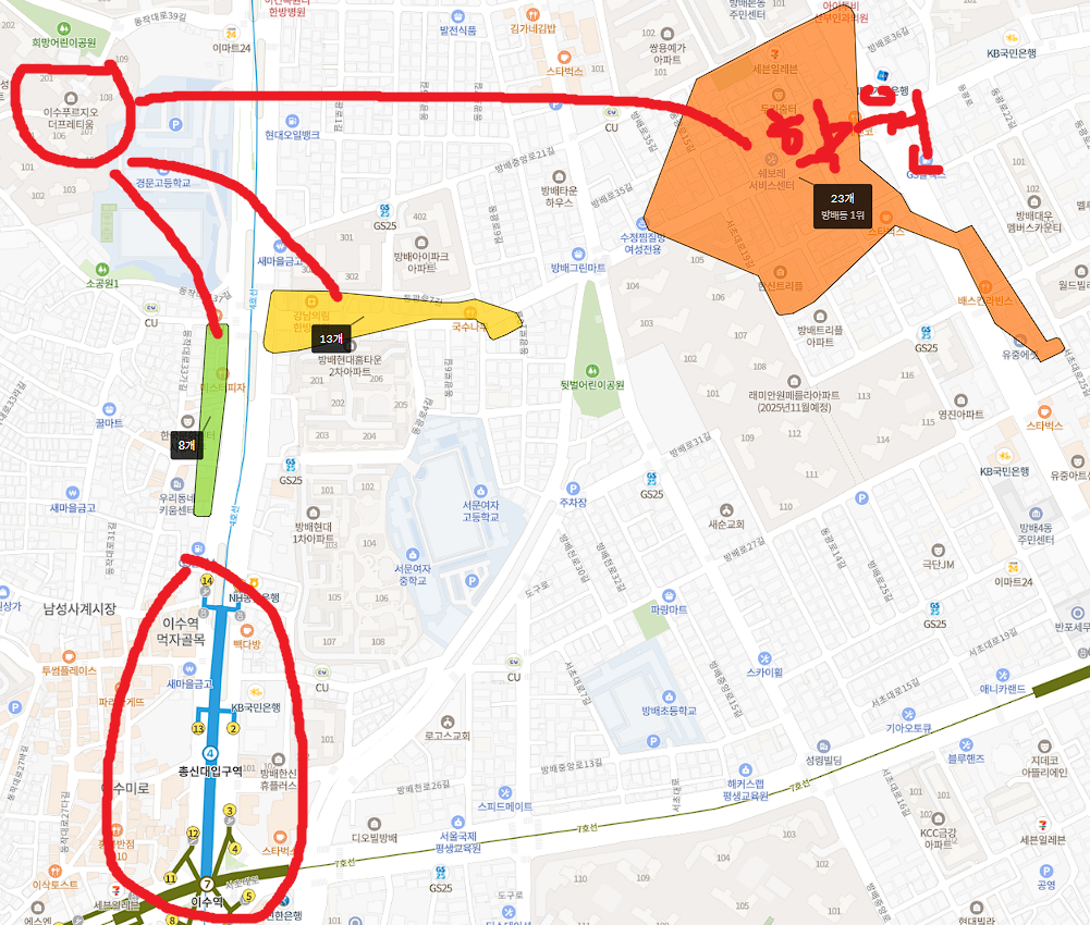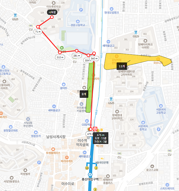 이수역푸르지오 더 프레티움의 주변환경 및 역과 강남역까지의 거리를 안내해드리겠습니다.