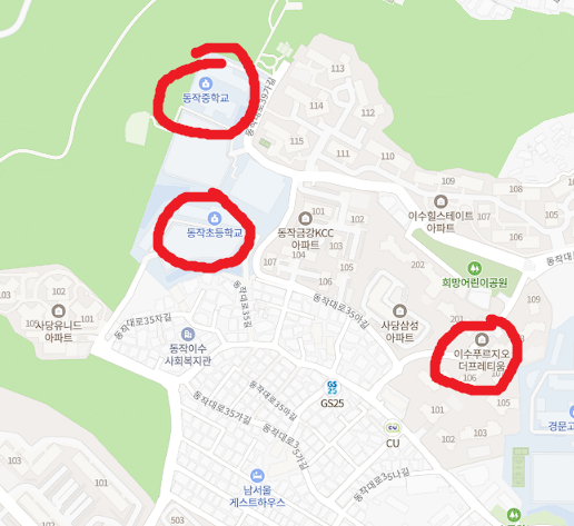 도보권에 동작초등학교와 동작중학교가 있습니다.