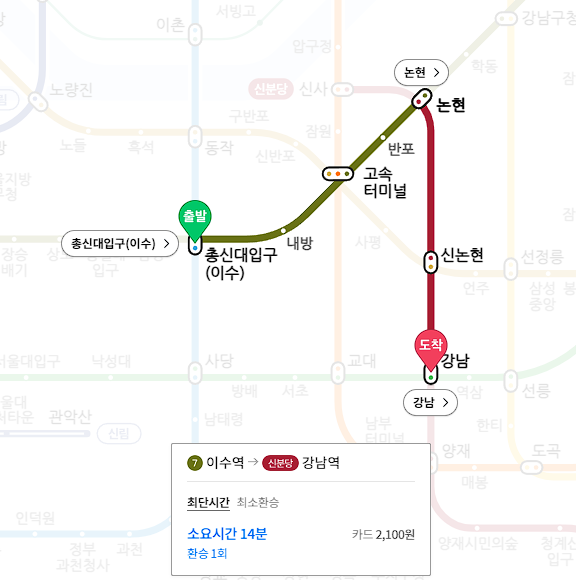 7호선 총신대입구까지 지하철로 14분 걸립니다.